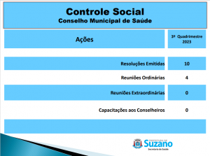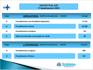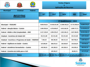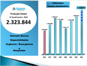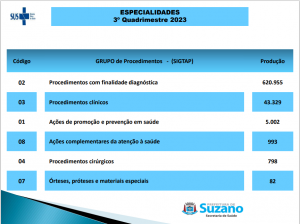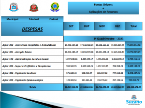 Ata da Segunda Audiência Pública de dois mil e vinte e quatro, realizada na Câmara de Vereadores “Palácio Deputado José de Souza Cândido”, nas dependências do Plenário “Francisco Marques Figueira”, cujo prédio fica situado na rua dos Três Poderes, nº 65, Jardim Paulista, em Suzano-SP. Ao vigésimo nono dia do mês de fevereiro de dois mil e vinte e quatro às dezoito horas e três minutos, deu-se início à Segunda Audiência Pública do Quarto Exercício da Décima Oitava Legislatura, sob a presidência do Ver. Joaquim Antonio da Rosa Neto – Joaquim Rosa – Presidente da Câmara de Suzano – que cumprimentou a todos os presentes, declarou aberta a sessão e anunciou que essa audiência tem a finalidade de analisar a prestação de contas do terceiro quadrimestre de 2023 da Secretaria Municipal de Planejamento e Finanças, conforme determina o artigo 9º no parágrafo 4º da Lei Complementar nº 101 de 04 de maio de 2000. O Presidente solicitou aos Vereadores, Leandro Alves de Faria, Artur Yukio Takayama e Jaime Siunte que recepcionassem no Plenário o Secretário Municipal de Saúde Diego Alves Ferreira ● (nota do setor de Taquigrafia, até a data da presente Audiência Pública, não foi comunicada, publicada ou informada via Diário Oficial, ou qualquer outro meio, a mudança do titular do cargo de Secretário Municipal de Saúde desta municipalidade, no entanto, as credenciais foram assim apresentadas) ●, convidou também para formar a Mesa de Trabalhos, Tânia Mara Porfírio, Diretora de Saúde; e Cintia Steffens Watanabe, Diretora da Rede de Urgência e Emergência. A seguir, convidou a adentrar ao Plenário Priscila Jane Arap, Coordenadora deda Zoonoses; Maria Cristina Perim, Diretora de Vigilância e Saúde; Mizael Rotta de Almeida, Diretor Administrativo; Paula Fróes Oliveira, Coordenadora de Regulação; André Moraes, Diretor d e Laboratório; Matheus Pompeo, Coordenador de Urgência e Emergência; Mauro dos Santos Ferreira, Coordenador de Assistência Farmacêutica; Margarida Mendes, Diretora Administrativa e Obras; e agradeceu a presença de Diomar Novaes, Assistente de Direção. Agradeceu a presença dos Vereadores e passou então a palavra ao Secretario para suas considerações iniciais e sua apresentação. O Secretário iniciou realizando seus cumprimentos e seguiu apresentando os dados se revezando com os demais membros da Mesa que compõem sua equipe.