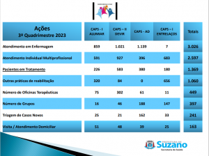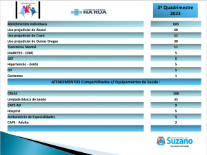 Então apresentou os dados referentes à Saúde Mental. Com os Equipamentos 1) Consultório na Rua; 2) CAPS I – Alumiar; 3) CAPS II – Devir; 4) CAPS – Álcool e Drogas; 5) CAPS I – Entrelaços, e; 6) Saúde Mental na Atenção Básica.