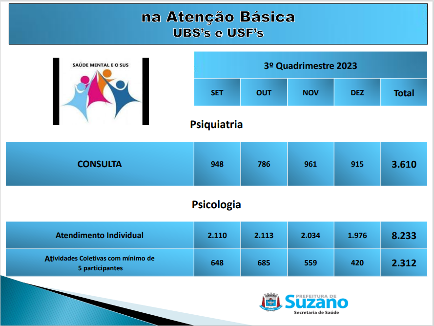 Então apresentou os dados referentes à Saúde Mental. Com os Equipamentos 1) Consultório na Rua; 2) CAPS I – Alumiar; 3) CAPS II – Devir; 4) CAPS – Álcool e Drogas; 5) CAPS I – Entrelaços, e; 6) Saúde Mental na Atenção Básica.