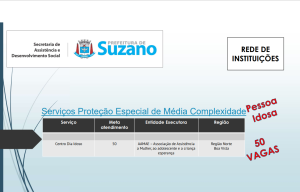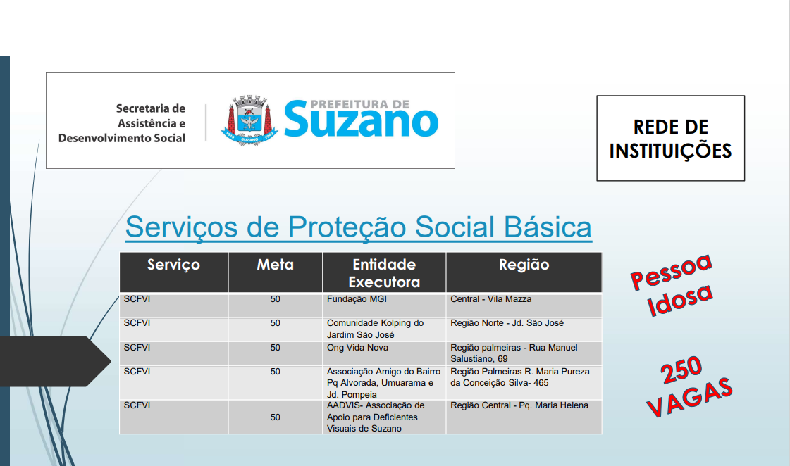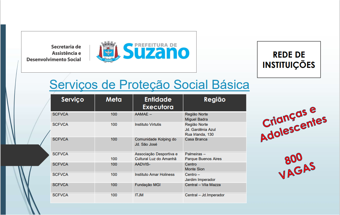 - 100 vagas em Serviços de Convivência e Fortalecimento de Vínculos;