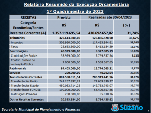 “IPTU – Imposto Sobre Propriedade Territorial Urbana: atingiu o montante de R$ 69,29 milhões, sendo 42,81% da previsão orçamentária. ISS – Imposto Sobre Serviços: arrecadado o valor de R$ 34,29 milhões, representando 33,95% do previsto. ITBI – Imposto Sobre Transmissão de Bens Imóveis: atingiu o montante de R$ 3,68 milhões, ou seja, 22,31% da previsão. TAXAS – Atingiram o montante de R$ 3,41 milhões, ou seja, 15,07% do previsto. AS TRANSFERÊNCIAS CORRENTES atingiram, até o 1º quadrimestre, o montante de R$ 280,92 milhões, 31,87% do previsto para 2023. E então apresentou os valores nos quadros a seguir.