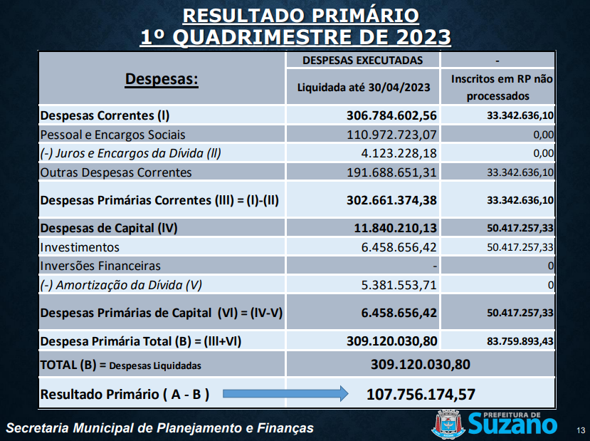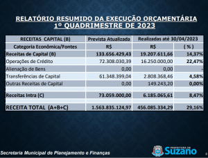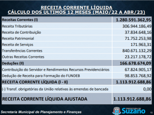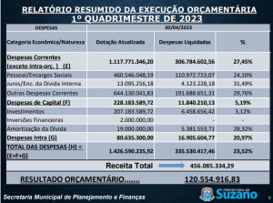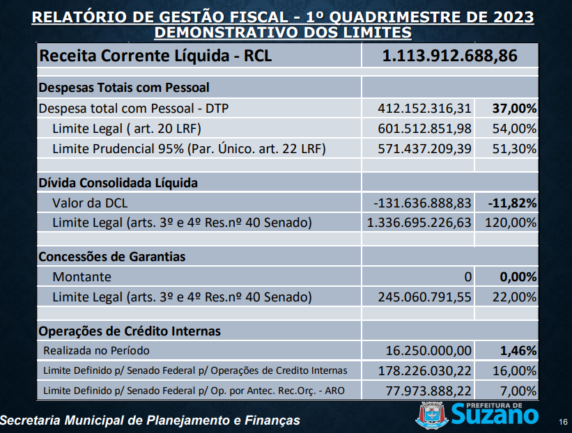 Ata da Sexta Audiência Pública de dois mil e vinte e três, realizada na Câmara de Vereadores “Palácio Deputado José de Souza Cândido”, nas dependências do Plenário “Francisco Marques Figueira”, cujo prédio fica situado na rua dos Três Poderes, nº 65, Jardim Paulista, em Suzano-SP. Ao décimo oitavo dia do mês de maio de dois mil e vinte e três às dezoito horas e um minuto, deu-se início à Sexta ‘’Audiência Pública do Segundo Exercício da Décima Oitava Legislatura, sob a presidência do Ver. Joaquim Antonio da Rosa Neto – Joaquim Rosa – Presidente da Câmara de Suzano – que cumprimentou a todos os presentes e, em nome de Deus e da Pátria, declarou aberta a sessão e anunciou que essa audiência tem a finalidade de analisar a prestação de contas do primeiro quadrimestre de 2023 da Secretaria Municipal de Planejamento e Finanças, conforme determina o artigo 9º no parágrafo 4º da Lei Complementar nº 101 de 04 de maio de 2000. O Presidente solicitou ao Vereador Artur Yukio Takayama para recepcionar no Plenário o Secretário Municipal de Planejamento e Finanças Itamar Corrêa Viana, convidou também para compor a Mesa a Diretora de Contabilidade, Adriana Melo, o Diretor de Receita, Ademilson Freire e também o Contador, Marcelo Rodrigues. A seguir, convidou a adentrar ao plenário os Contador, Claudinei Estevão e Maurício Bento e também o Assessor Jurídico Geraldo de Melo Júnior. Passou então a palavra ao Secretário Municipal de Planejamento e Finanças para as considerações iniciais e a seguir a apresentação. O Secretário iniciou realizando seus cumprimentos e então explicou que esta Audiência Pública é fundamentada na Lei Complementar nº 101/2000 – Lei de Responsabilidade Fiscal, artigo 9º, § 4º – Até o final dos meses de maio, setembro e fevereiro, este mês, o Poder Executivo demonstrará e avaliará o cumprimento das metas fiscais de cada quadrimestre, em Audiência Pública na Comissão referida no § 1º do art. 166 da Constituição ou equivalente nas Casas Legislativas estaduais ou municipais. Apontou que sendo final do mês de maio é o cumprimento legal o relatório. Explicou então que a Prestação de Contas a ser apresentada é composta por: ● Relatório Resumido da Execução Orçamentária; ● Resultado Primário; ● Receita Corrente Líquida; ● Despesa com Pessoal e ● Relatório de Gestão Fiscal. Então apresentou os valores no quadro.