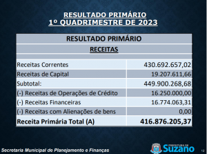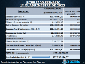 Que explicou que do RESULTADO PRIMÁRIO DO 1º QUADRIMESTRE DE 2023 – São excluídas as receitas e despesas financeiras, indicando se o nível dos gastos orçamentários (não financeiro) do município estão compatíveis com a sua arrecadação, ou seja, se as Receitas Primárias são capazes de suportar as Despesas Primárias.” A seguir apresentou os valores de Receita Corrente Líquida.
