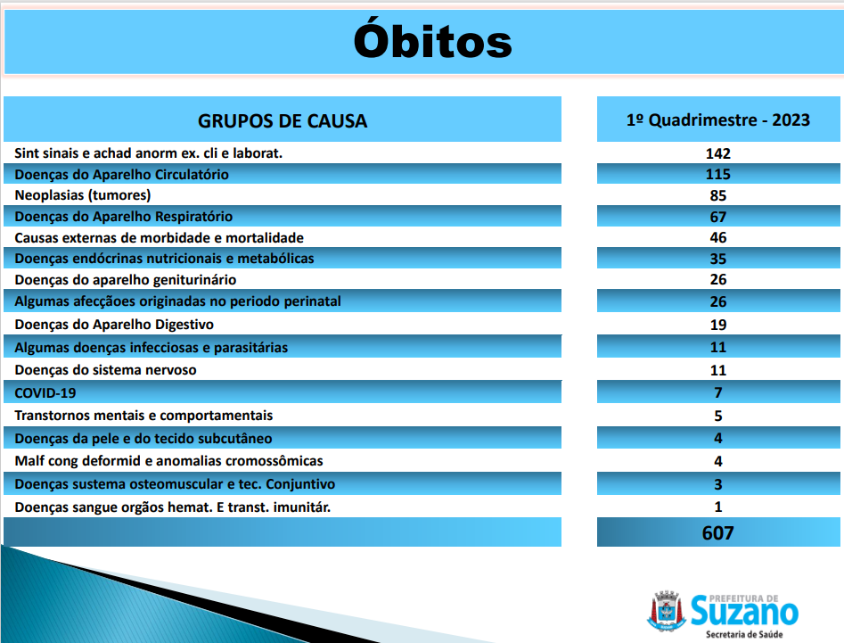 Então apresentou os números de óbitos na cidade. Com o número de registros totais em 607 (seiscentos e sete).