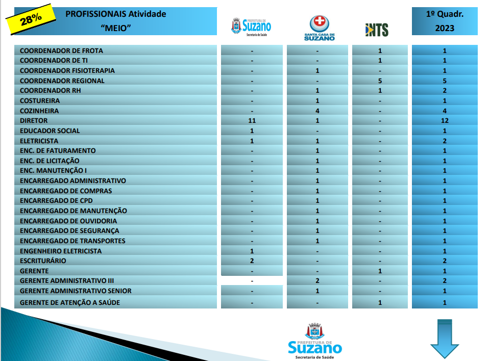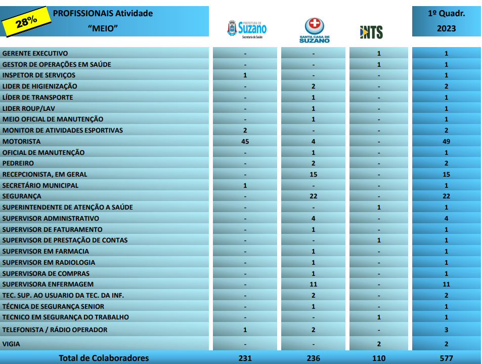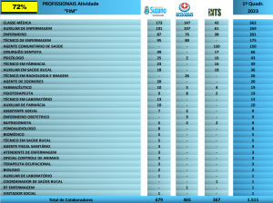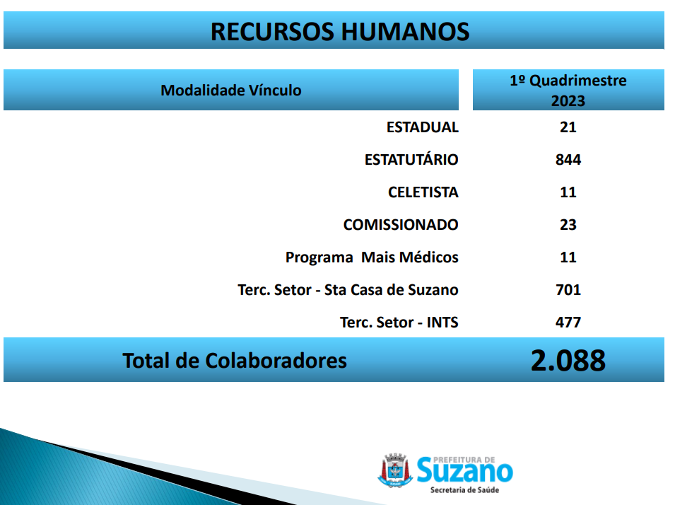 Em seguida apresentou os números de recursos humanos no sistema de saúde municipal. Sendo dois mil, oitocentos e oitenta e oito trabalhadores. Destes, trezentos e sessenta e dois são médicos, que compõem parte dos profissionais chamados “Fim” que somam um total de 78% destes dois mil, oitocentos e oitenta e oito trabalhadores. Enquanto os restantes 22%, são os Profissionais “Meio” que realizam serviços administrativos e operacionais.