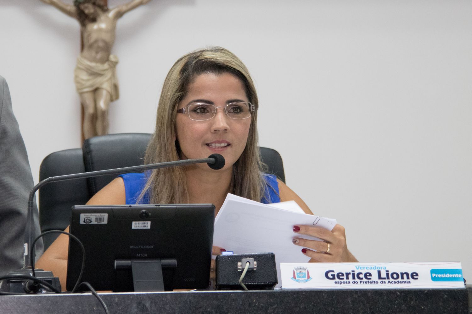Descrição da imagem #PraCegoVer: sentada atrás da Mesa Diretiva da Câmara, a presidente da Câmara, Gerice, fala ao microfone.