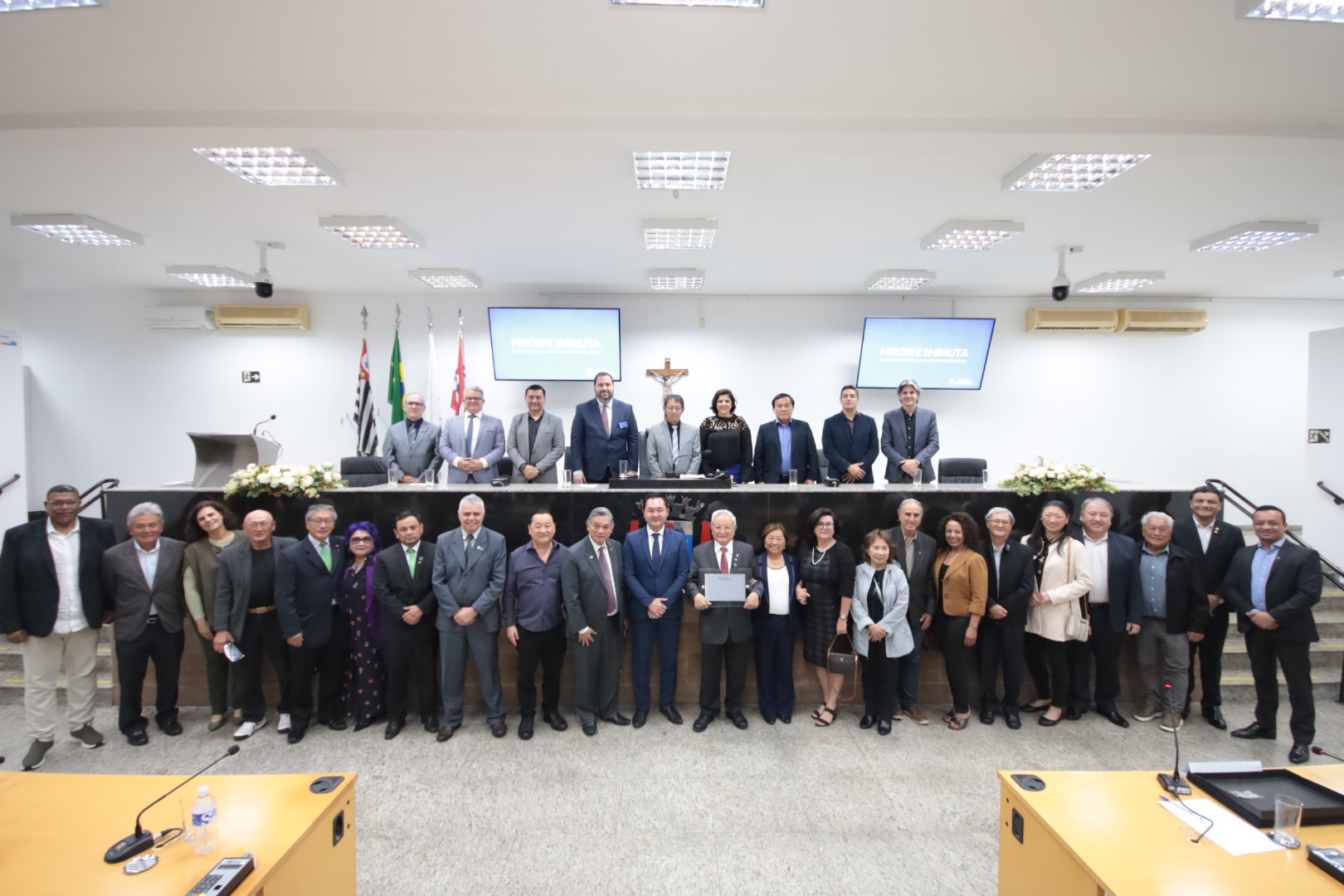A solenidade foi presidida pelo vereador Artur Takayama (PL) e a homenagem foi proposta pelo vereador Edirlei Junio Reis (PL), o professor Edirlei, com aprovação unânime do Plenário. “O senhor Hiroshi direcionou seu ikigai (propósito em japonês) para servir. Sua caminhada em Suzano prova que prosperidade e responsabilidade social podem andar juntas”, destacou Edirlei, que também frisou que a homenagem foi uma indicação do secretário de Meio Ambiente de Suzano, André Chiang.
