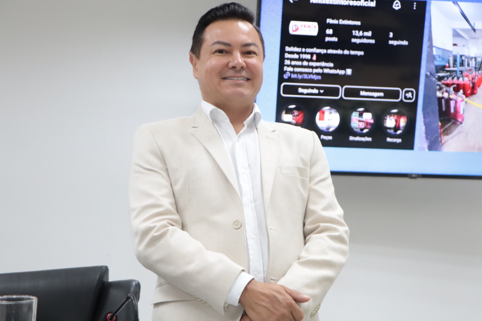 Descrição da imagem #PraCegoVer: vereador Marcel da ONG de pé, sorrindo para a câmera. Ele usa blazer claro sobre uma camisa social branca.