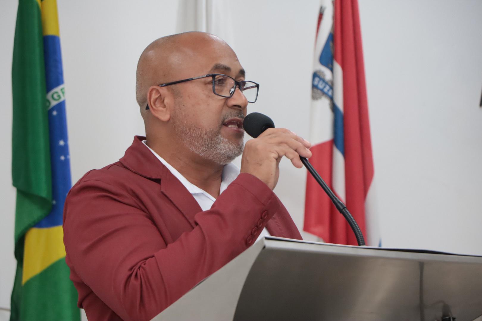 Descrição da imagem #PraCegoVer: vereador Josias Mineiro fala ao microfone na Tribuna da Câmara. Ele usa óculos e veste um blazer vermelho escuro e camisa social branca.