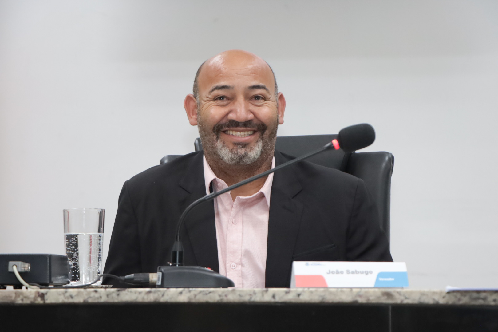 Descrição da imagem #PraCegoVer: vereador João Sabugo, sentado na Mesa Diretiva da Câmara, sorri para a foto. Ele usa blazer preto e camisa social rosa.