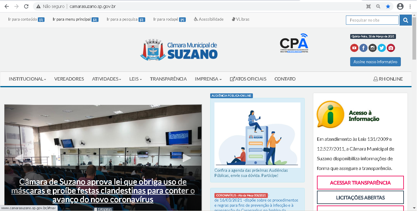 Descrição da imagem #PraCegoVer: print screen da capa do portal da Câmara de Suzano.