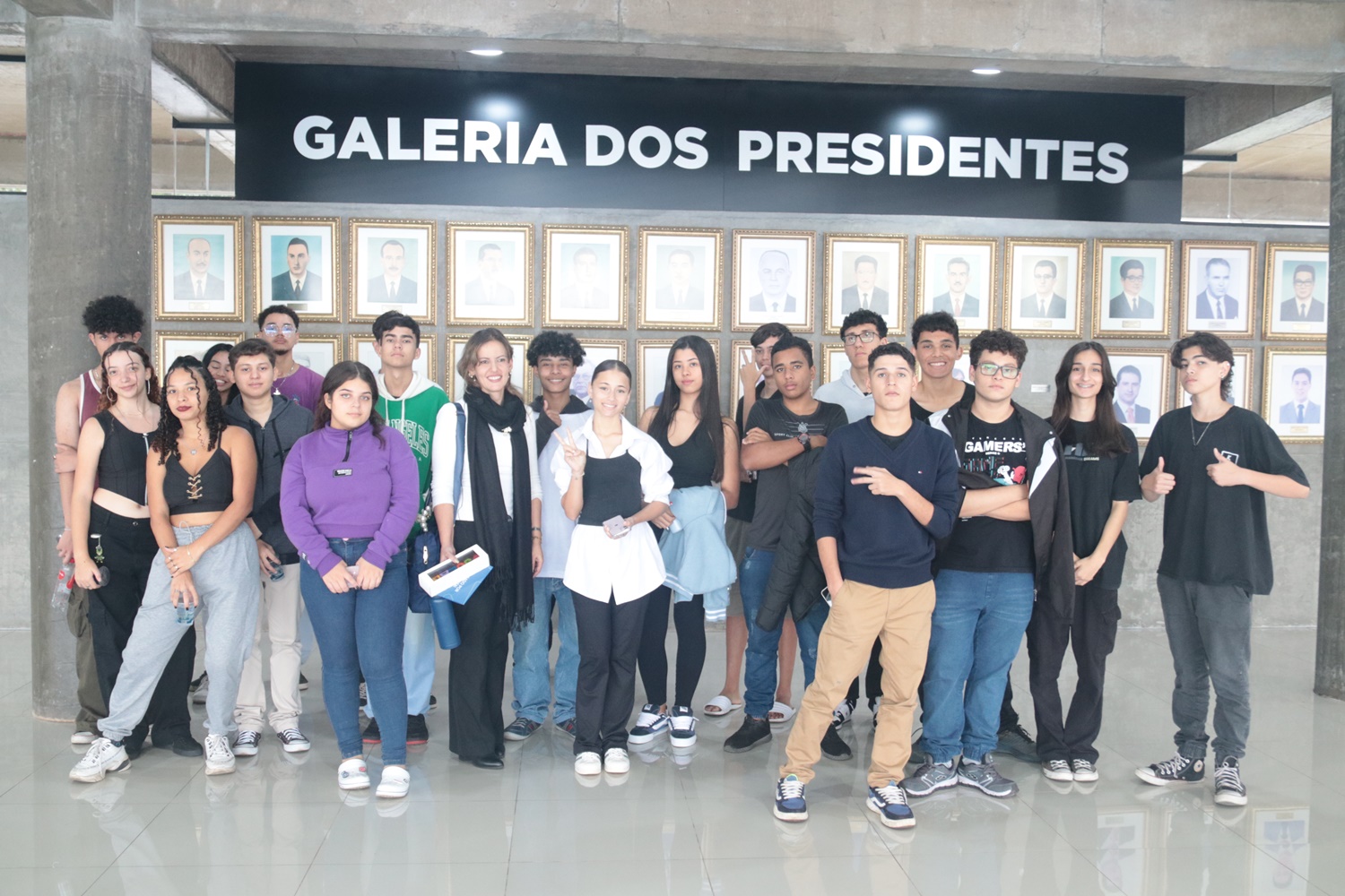 Descrição da imagem #PraCegoVer: de pé, em frente aos quadros que compõem a Galeria dos Presidentes, estudantes posam para foto.