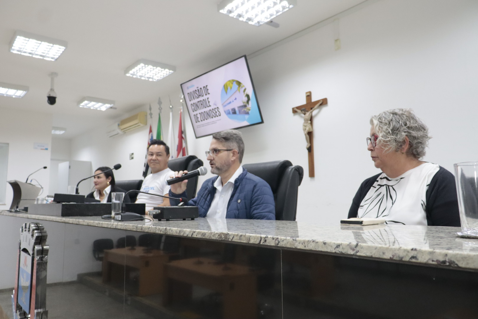Descrição da imagem #PraCegoVer: sentados na Mesa Diretiva da Câmara estão, da esquerda para a direita, a diretora Gláucia Paulino, o vereador Marcel da ONG, o então secretário Diego Ferreira (ao microfone) e a diretora Priscila Arap, durante audiência do setor de Controle de Zoonoses realizada no ano passado.