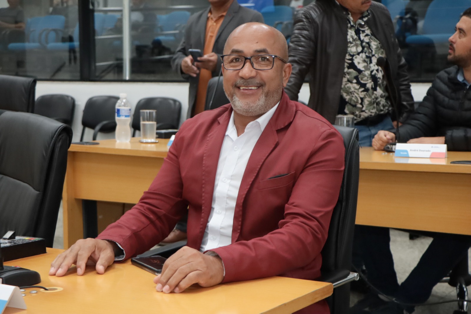 Descrição da imagem #PraCegoVer: vereador Josias Mineiro sentado atrás de sua mesa no Plenário da Câmara. Ele usa óculos, blazer vermelho escuro e camisa branca.