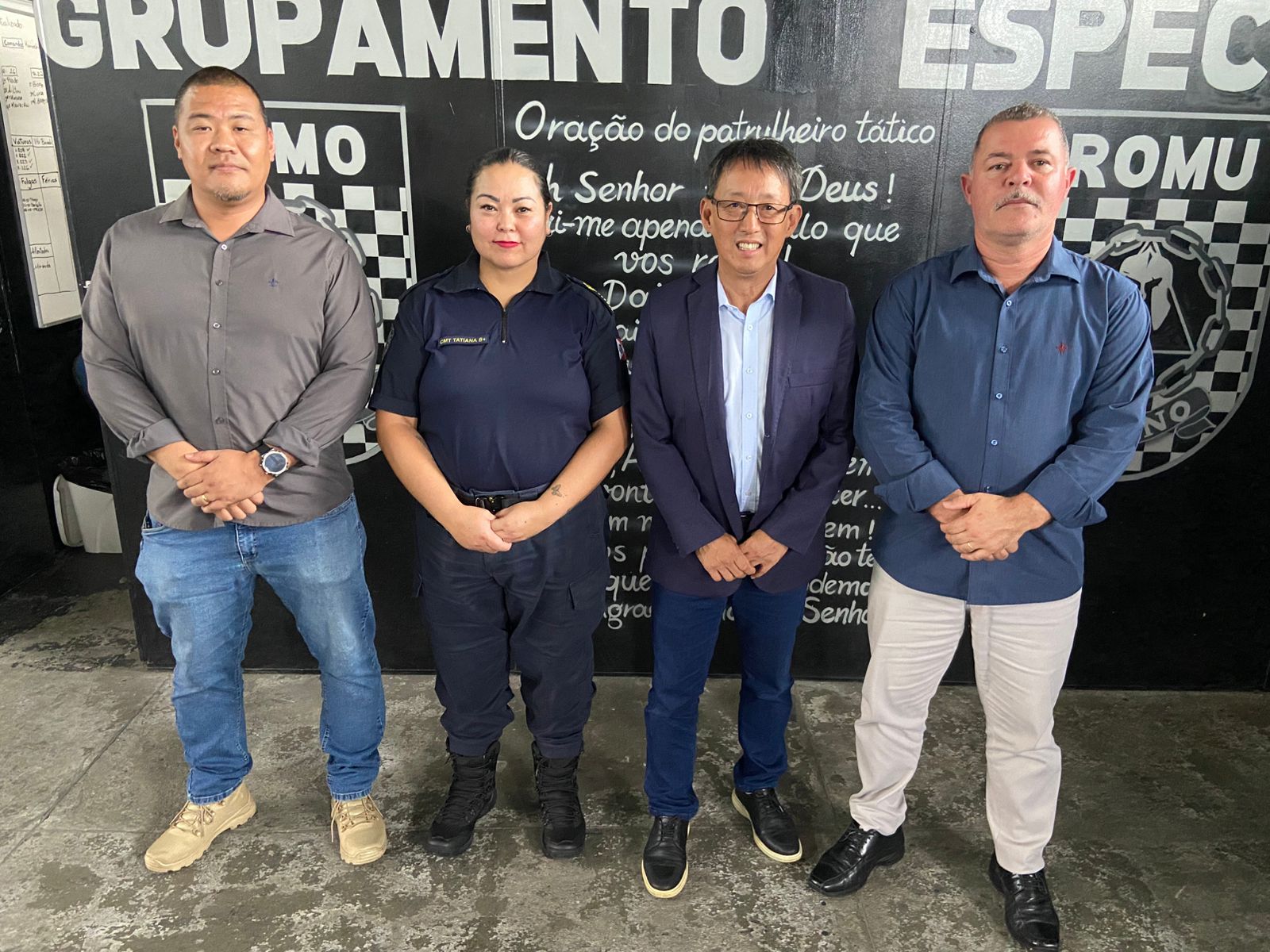Descrição da imagem #PraCegoVer: de pé, estão, um ao lado do outro, da esquerda para a direita, o assessor estratégico Marcelo Miyasaki, a comandante da GCM Tatiana Orita, o presidente da Câmara Artur Takayama e o secretário de Segurança Cidadã Francisco Balbino.