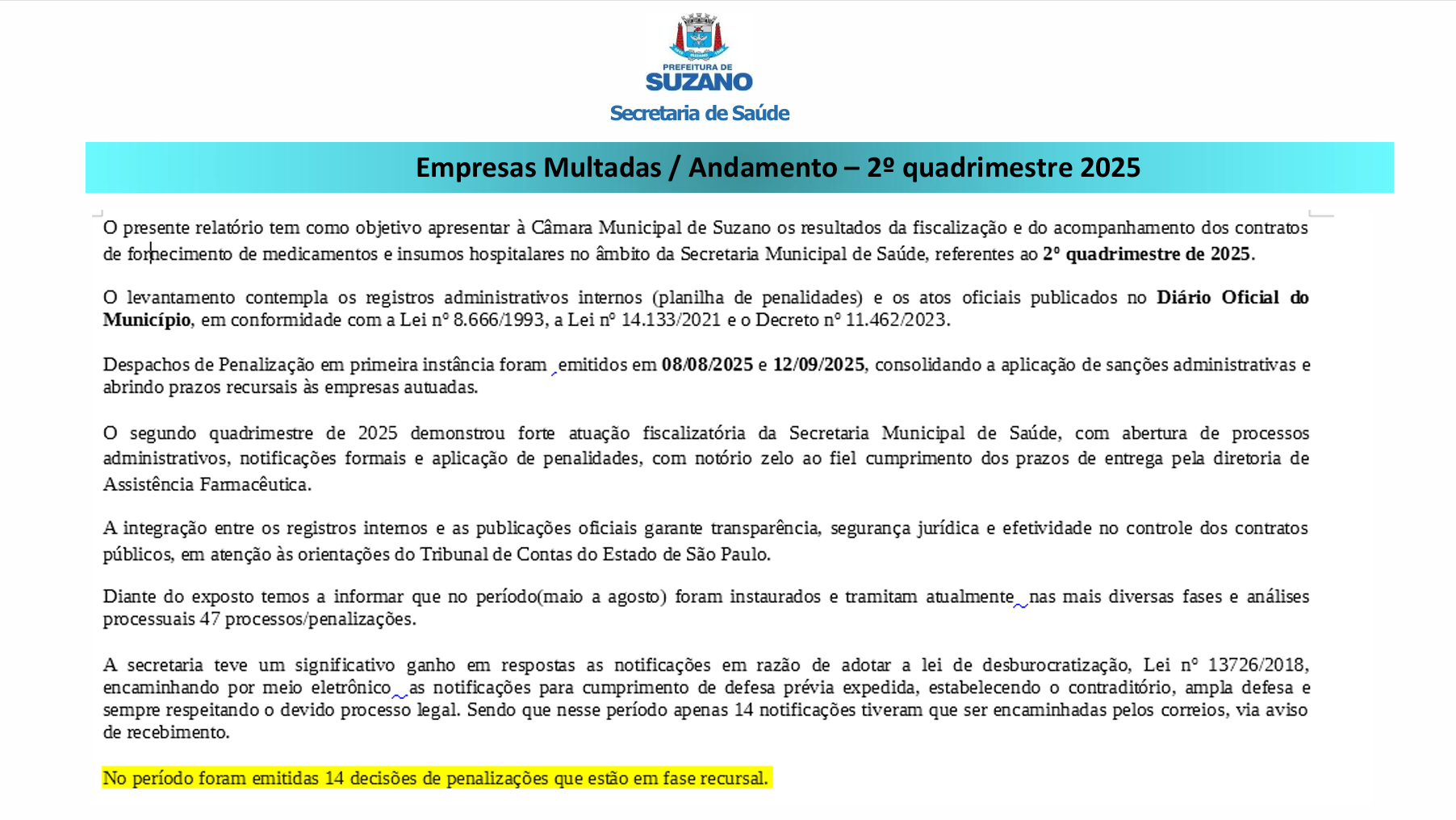 O presente relatório tem como objetivo apresentar à Câmara Municipal de Suzano os resultados da fiscalização e do acompanhamento dos contratos de fornecimento de medicamentos e insumos hospitalares no âmbito da Secretaria Municipal de Saúde, referentes ao 2º quadrimestre de 2025.