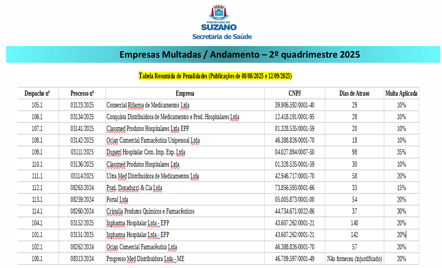 A imagem apresenta um documento oficial da Prefeitura de Suzano, vinculado à Secretaria de Saúde, com o título “Empresas Multadas / Andamento – 2º quadrimestre de 2025”. No topo, há uma faixa azul contendo o brasão e o logotipo da prefeitura, e logo abaixo o subtítulo destacado em amarelo informa: “Tabela Resumida de Penalidades (Publicações de 08/08/2025 e 12/09/2025)”.
