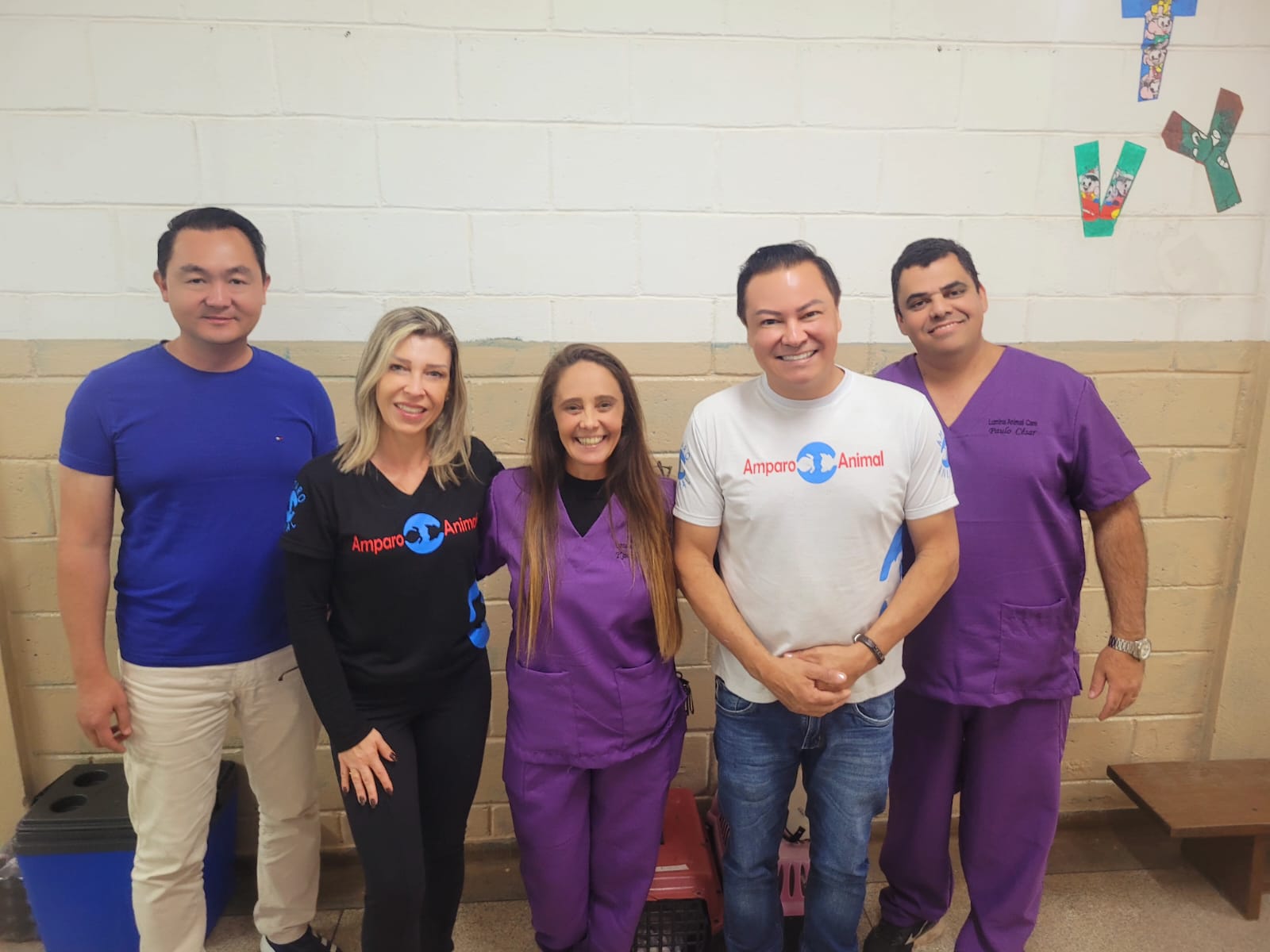 Descrição da imagem #PraCegoVer: de pé, lado a lado, estão, da esquerda para a direita, o secretário de Meio Ambiente, André Chiang, a assessora Priscila Farah, a médica veterinária Karina Júlio, o vereador Marcel da ONG e o médico veterinário Paulo César. Todos sorriem para a câmera.