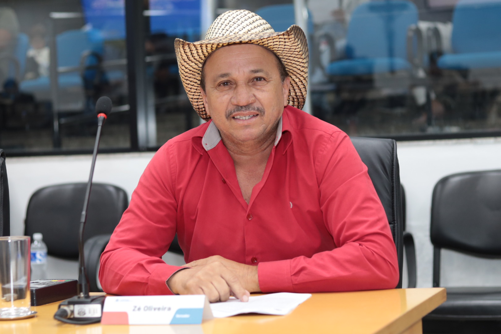 Descrição da imagem #PraCegoVer: vereador Zé Oliveira sentado atrás de sua mesa no Plenário. Ele usa chapéu e uma camisa social vermelha.