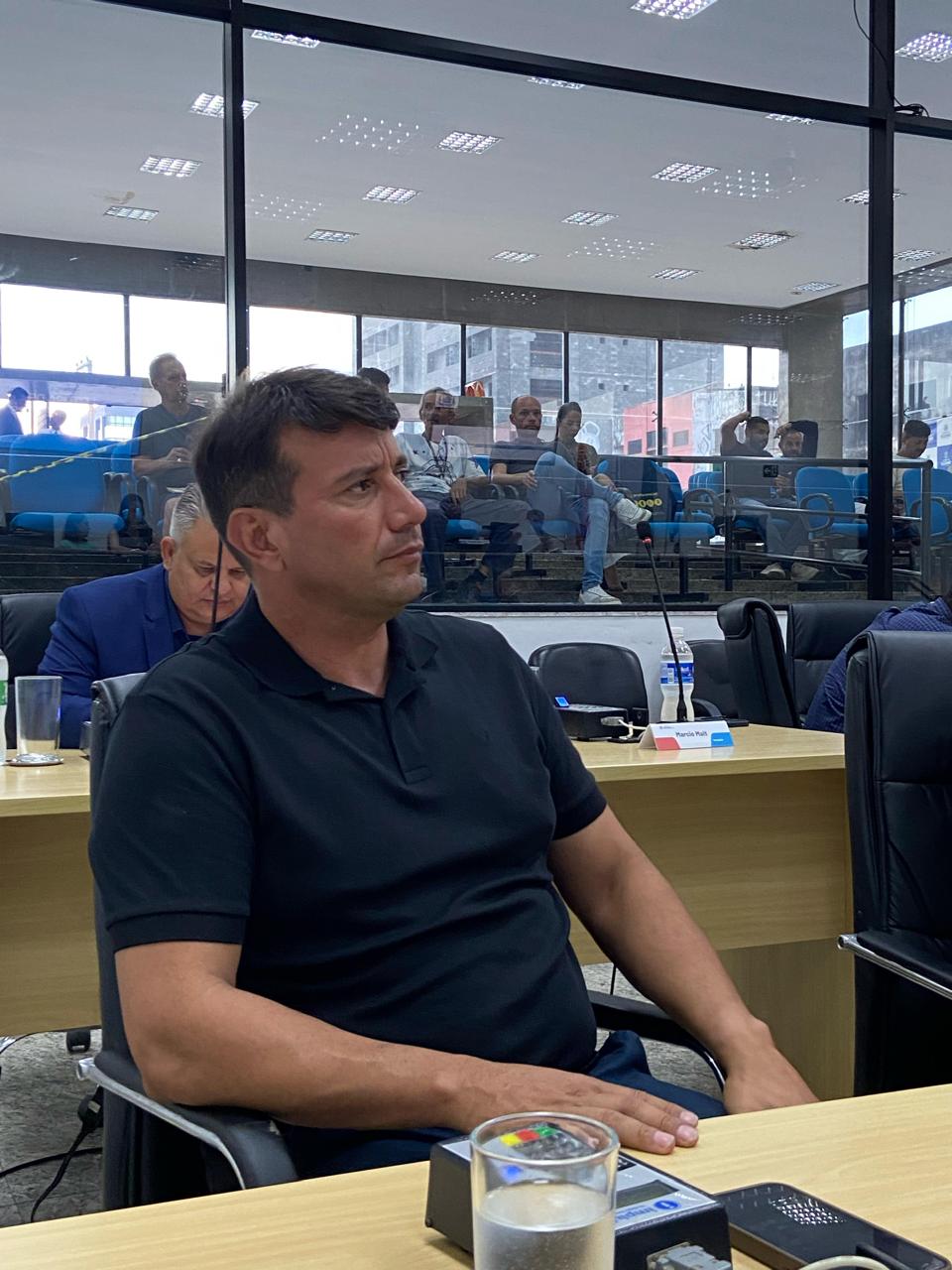 Descrição da imagem #PraCegoVer: vereador Adilson Horse sentado em sua mesa no Plenário da Câmara de Suzano, tendo ao fundo o público na Galeria.