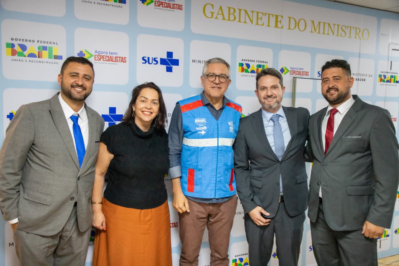 Descrição da imagem #PraCegoVer: de pé, da esquerda para a direita, estão Allan Dourado; a diretora de Atenção à Saúde de Suzano, Alcione Sena; o ministro Alexandre Padilha; o secretário de Saúde de Suzano, Diego Ferreira; e o vereador André Dourado. Todos sorriem para a câmera.