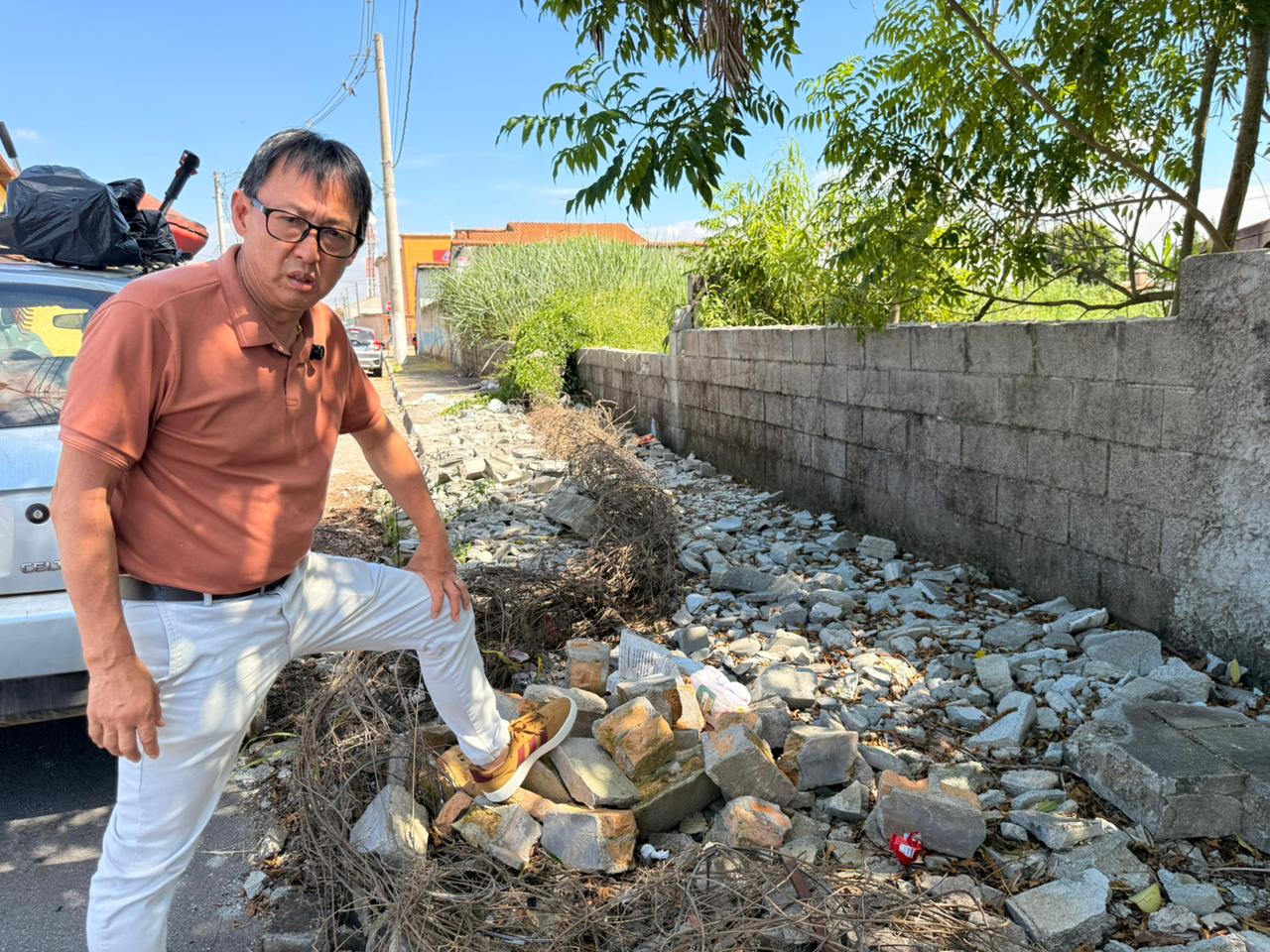 Descrição da imagem #PraCegoVer: vereador Artur Takayama posa para foto em frente à calçada cheia de restos de entulho.