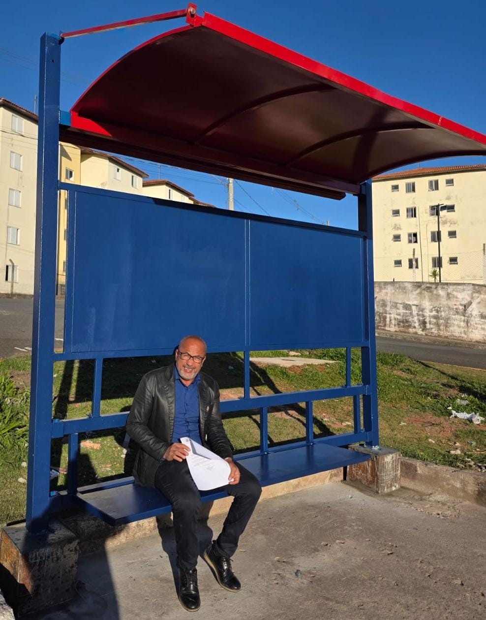 Descrição da imagem #PraCegoVer: vereador Josias Mineiro sorri sentado banco de abrigo de ônibus recém-instalado. A estrutura metálica é azul com cobertura vermelha.