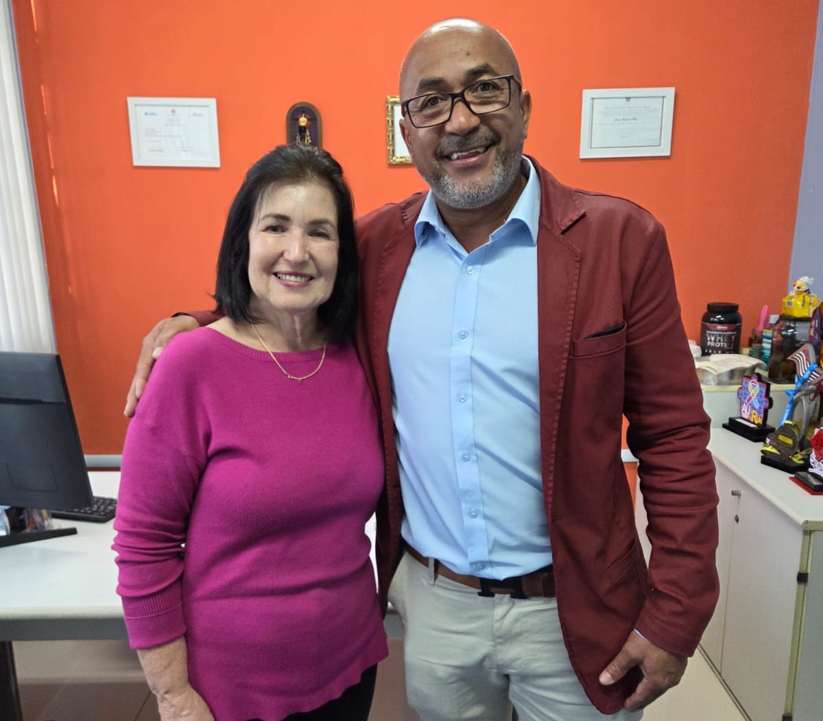 Descrição da imagem #PraCegoVer: de pé, diretora Carmen Lúcia Lorente e o vereador Josias Mineiro sorriem para a foto. ela usa uma blusa de mangas compridas pink e ele usa óculos, camisa social azul clara e um blazer vermelho escuro.