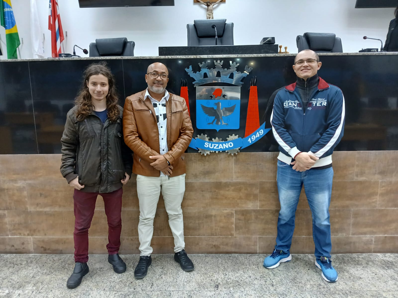 Descrição da imagem #PraCegoVer: vereador Josias Mineiro (ao centro), no Plenário da Câmara, ladeado pelo árbitro e jogador Gabriel Amorim e o diretor da Associação de Xadrez de Suzano, Cíceero Tavares.