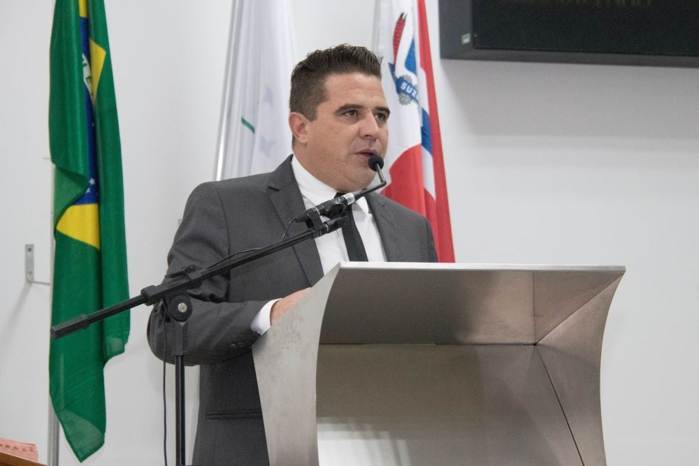 Descrição da imagem #PraCegoVer: de pé, vereador Leandrinho fala ao microfone na Tribuna da Câmara. Ele usa terno e gravata. Ao fundo, estão as bandeiras do Brasil, do Mercosul e de Suzano.