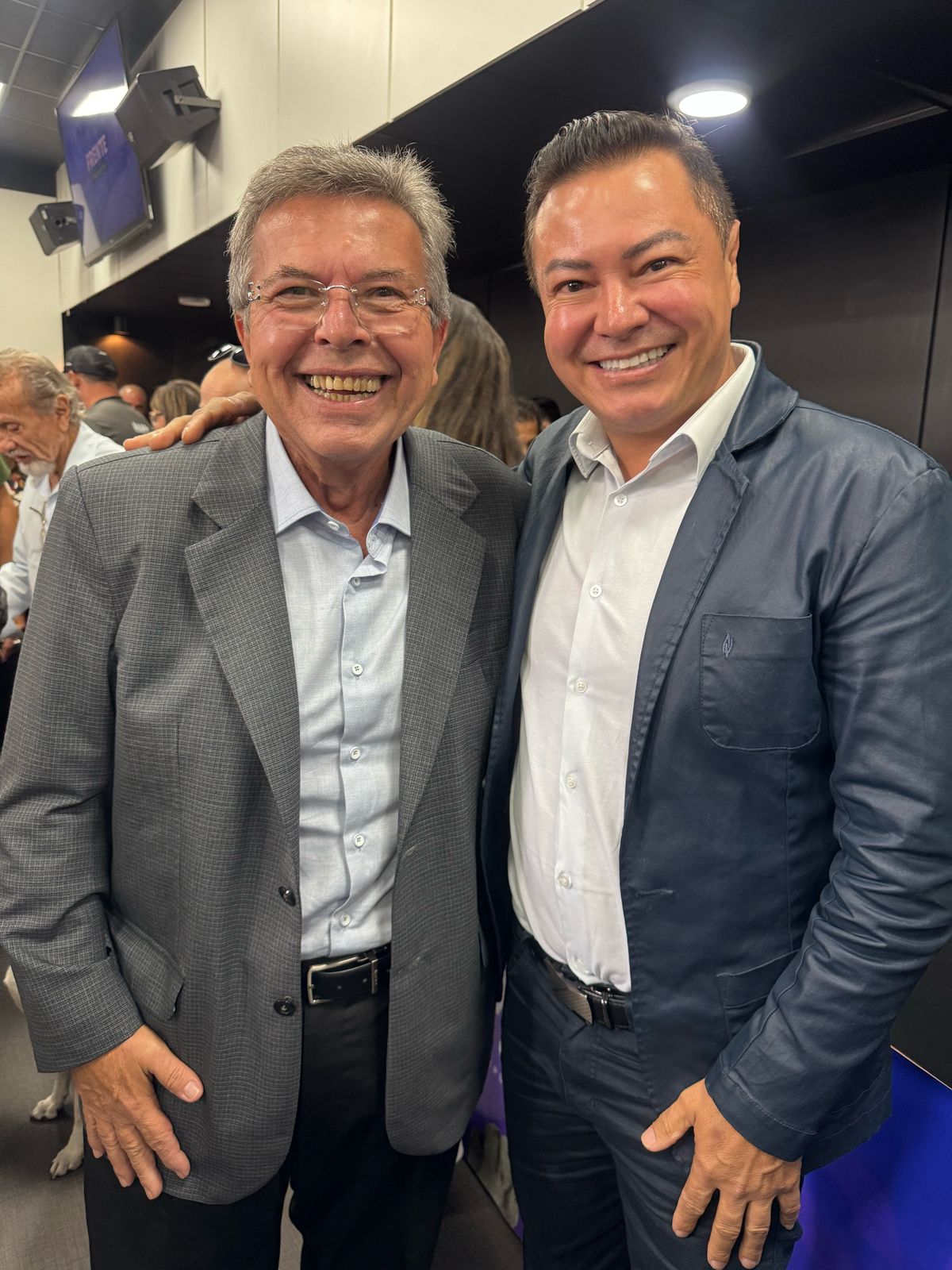 Descrição da imagem #PraCegoVer: deputado estadual Carlão Pignatari e vereador Marcel da ONG sorriem para foto. Ambos usam blazer e camisa social.