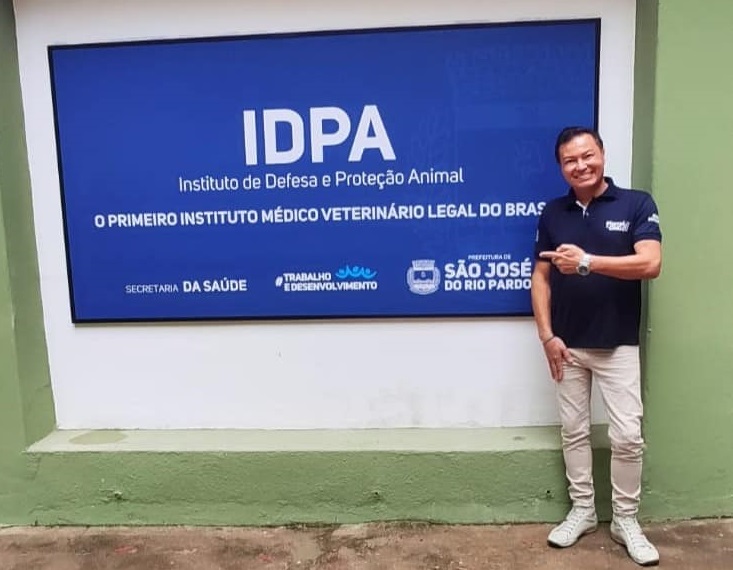 Descrição da Imagem: #PraCegoVer: Vereador Marcel da ONG, em pé, ao lado de um uma placa com os dizeres: IDPA. Instituto de Defesa e Proteção Animal. O primeiro Instituto Médico Veterinário Legal do Brasi. Secretaria da Saúde. Trabalho e Desenvolvimento. Prefeitura de São José do Rio Pardo.
