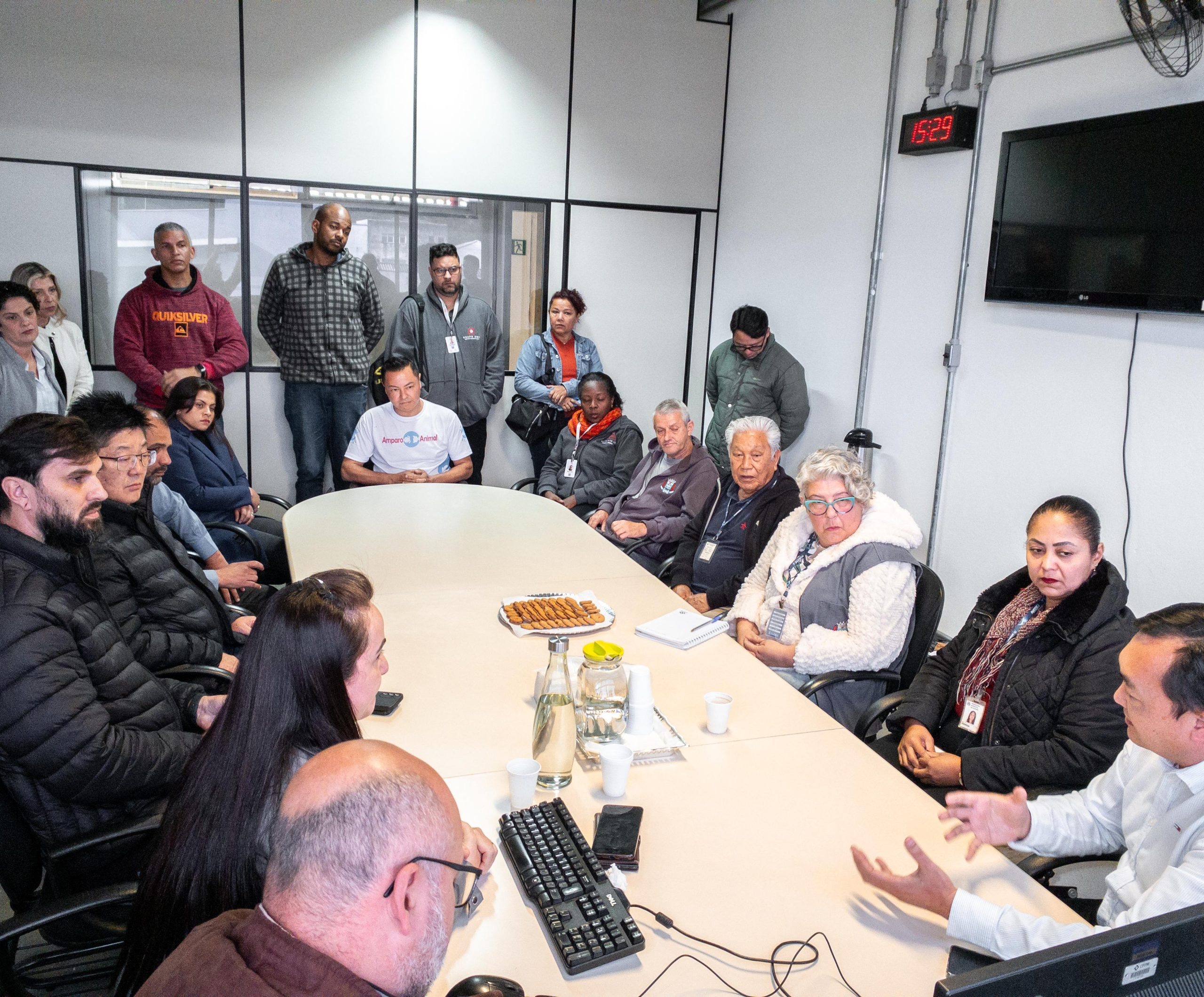 Descrição da imagem #PraCegoVer: comerciantes, representantes do Poder Público e da CPTM conversando em uma sala de reunião.