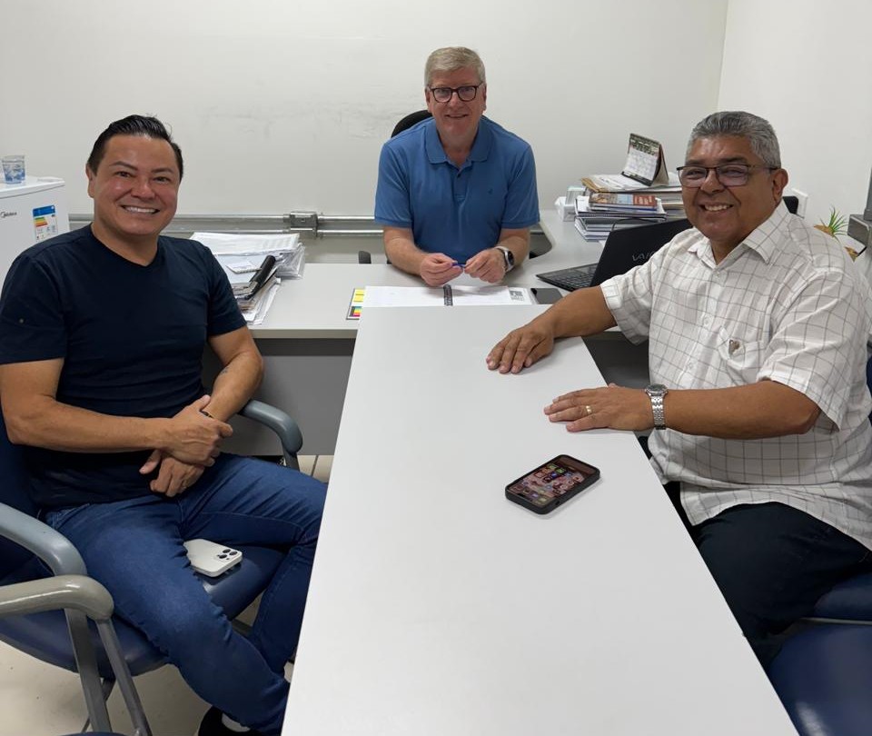Descrição da imagem #PraCegoVer: sentados em torno de uma mesa estão, da esquerda para a direita, Marcel da ONG, secretário Samuel de Oliveira e diretor Ari Santos.