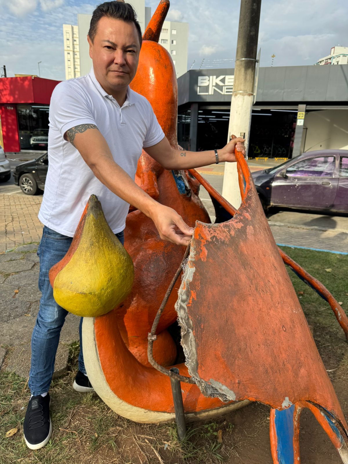 Descrição da imagem #PraCegoVer: de pé, vereador Marcel da ONG segura asa quebrada de Pokémon instalado na praça dos Expedicionários.