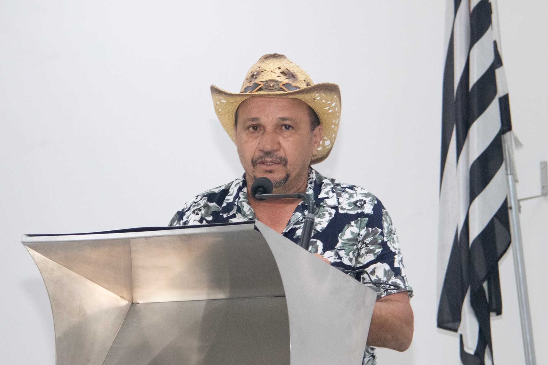Descrição da imagem #PraCegoVer: vereador Zé Oliveira fala ao microfone na Tribuna da Câmara. Ele usa chapéu e uma camisa estampada.