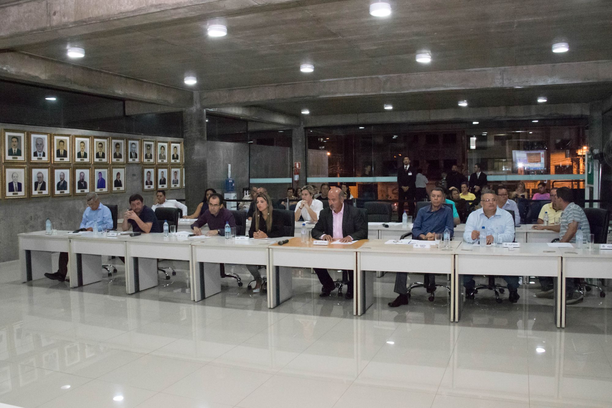 Descrição da imagem #PraCegoVer: vereadores de Suzano sentados atrás de suas mesas durante sessão do dia 3 de outubro.