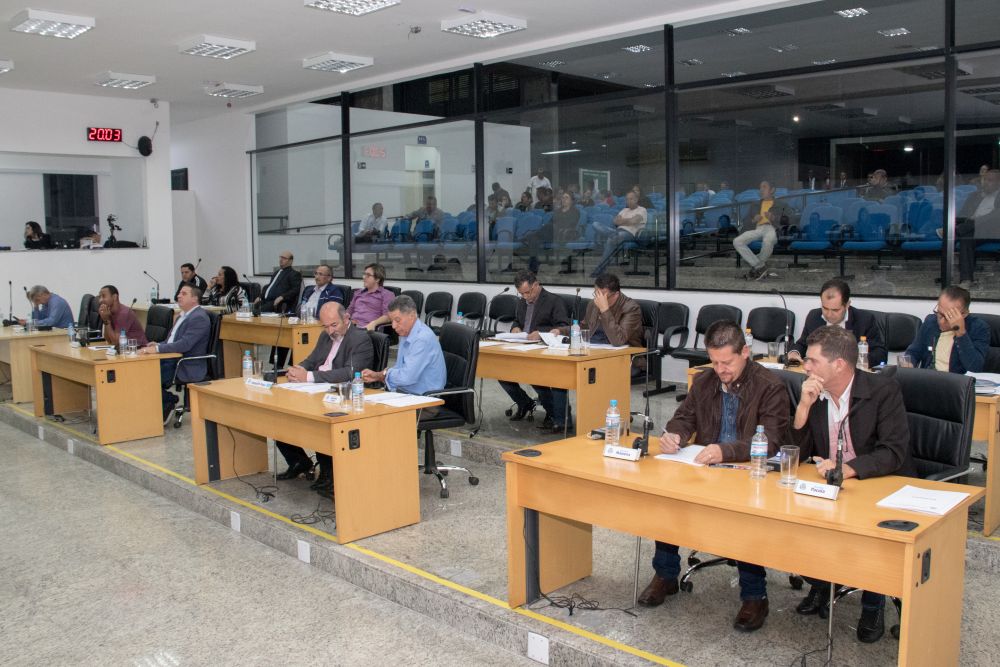 Descrição da imagem #PraCegoVer: vereadores sentados atrás de suas mesas no Plenário da Câmara.