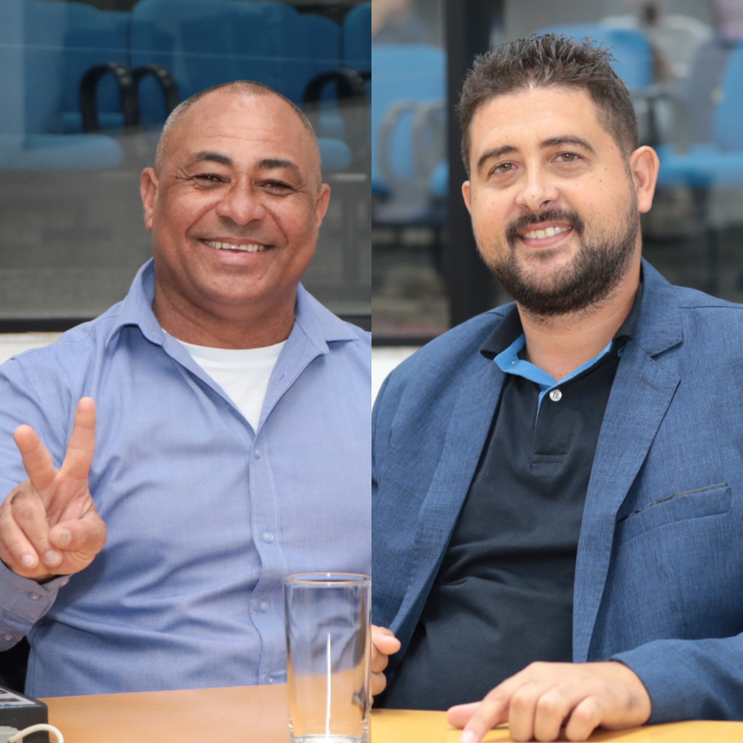 Descrição da imagem #PraCegoVer: montagem feita com as fotos lado a lado dos vereadores Baiano da Saúde e André Dourado. Ambos estão sentados em suas mesas no Plenário da Câmara. Baiano da Saúde usa uma camisa social azul, sorri para a câmera e faz o sinal de V com a mão. André Dourado usa uma camisa polo azul escura, um blazer e também sorri para a foto.
