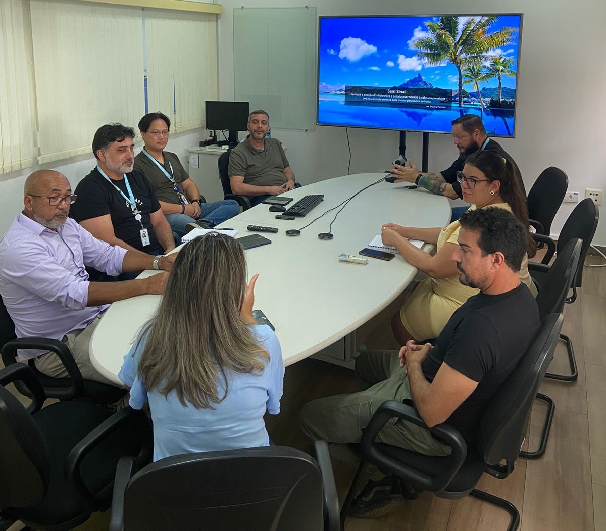 Descrição da imagem #PraCegoVer: vereador Josias Mineiro (de óculos, sentado à esquerda da imagem) e vereador Marcio Malt (de camiseta preta, à direita da imagem) em volta de uma mesa oval com funcionários da Sabesp.