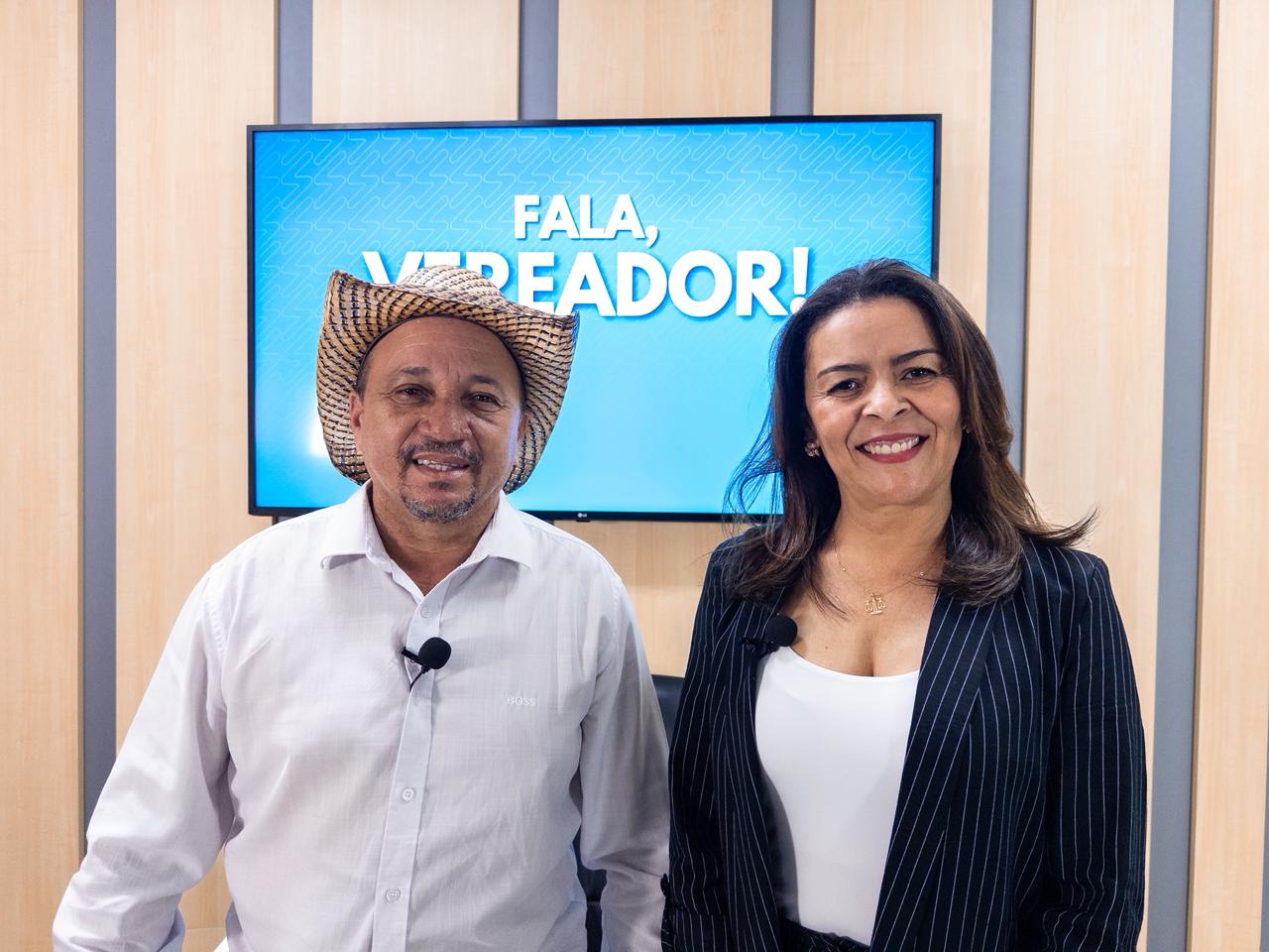 Descrição da imagem #PraCegoVer: no estúdio da TV Câmara, vereador Zé Oliveira (de chapéu e camisa social branca) e advogada Patrícia Braga (de blazer escuro e blusa branca) sorriem para foto.